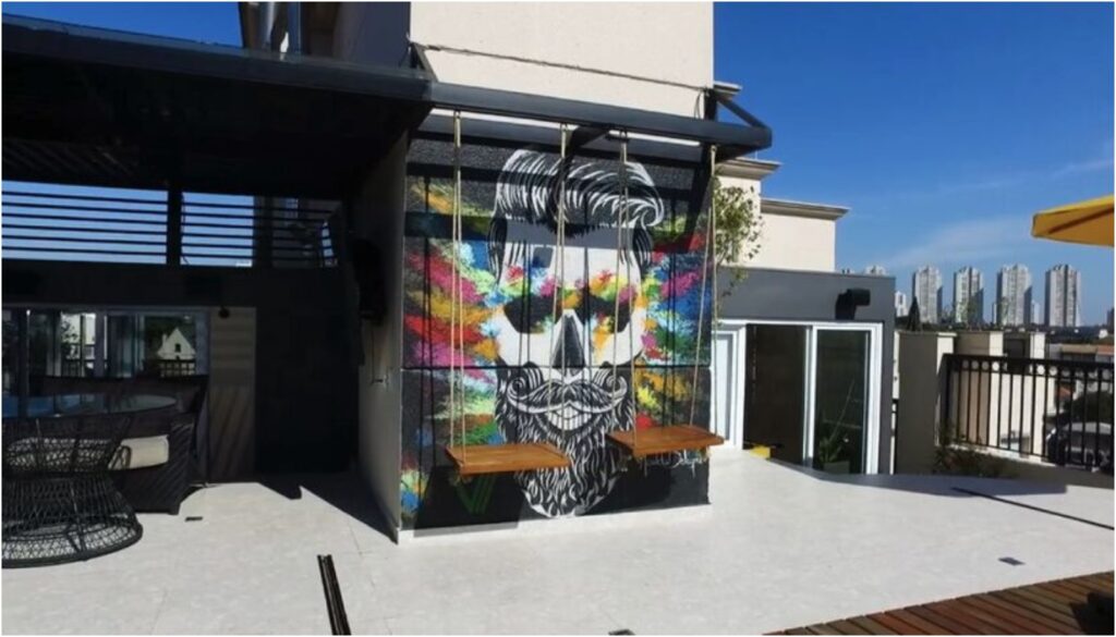 Com cinco quartos e projeto arquitetônico voltado para a integração total dos ambientes, o apartamento teve área externa personalizada pela arquiteta Patrícia Moreno. Um dos destaques é o deck móvel motorizado, que desliza sobre a piscina e amplia a área útil durante encontros e recepções.