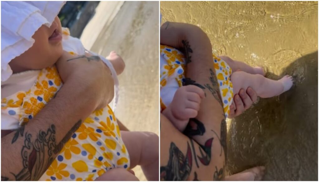No colo de Luan, Serena molha os pezinhos no mar, bem perto da areia e não esconde a alegria diante da novidade. “Serena conhecendo o mar”, escreveu o cantor na legenda.