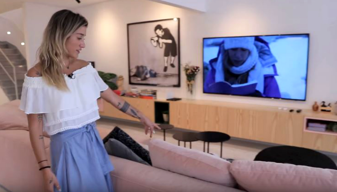 Ela também preferiu ter menos móveis e revelou que dava muita importância para um ambiente aconchegante onde pudesse assistir televisão. Por isso, a sala conta com um sofá grande e espaçoso, feito sob medida em tom nude, posicionado em frente a uma estante.